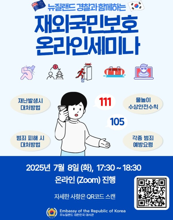 주뉴질랜드대한민국대사관(대사 김창식)은 지난 7월 8일 오후 5시 30분부터 6시 30분까지, 뉴질랜드 내 체류 및 거주 중인 재외국민을 대상으로 ‘재외국민보호 온라인 세미나’를 개최했다.