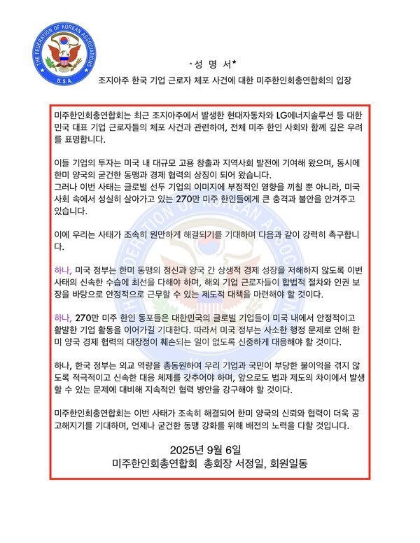 북미 [성명서]'조지아주 한국기업 근로자 체포사건' 미주총연 입장 "270만 미주 한인들에게 큰 충격과 불안" "해외기업 근로자들의 안정적 근무 위한 제도적 대책 마련해야" 재외동포신문 입력 2025.09.09 16:13 댓글 0 SNS 기사보내기 카카오톡 다른 공유 찾기 기사스크랩하기 인쇄 이 기사를 공유합니다 페이스북(으)로 기사보내기 트위터(으)로 기사보내기 카카오톡(으)로 기사보내기 URL복사(으)로 기사보내기 닫기 본문 글씨 키우기 가 본문 글씨 줄이기 저작권자 © 재외동포신문 무단전재 및 재배포 금지 재외동포신문 dongponews@hanmail.net 다른기사 보기 관련기사 “자칫 가족과 생이별 하게 될 수도..신중해야”...정부, 구금한국인 귀국준비 착수 키워드 #미주총연 #조지아 #애틀랜타 #합작공장 #불법체류 개의 댓글 회원로그인 작성자 비밀번호 댓글 내용입력 댓글 정렬 최신순 추천순 답글순 BEST댓글 BEST 댓글 답글과 추천수를 합산하여 자동으로 노출됩니다. 닫기 더보기 댓글삭제 삭제한 댓글은 다시 복구할 수 없습니다. 그래도 삭제하시겠습니까? 비밀번호 닫기 댓글수정 댓글 수정은 작성 후 1분내에만 가능합니다. 본문 / 400 비밀번호 닫기 내 댓글 모음 닫기 주요뉴스 4대 은행 3분기 해외실적 ‘엇갈린 성적표’… 신한·국민 ‘선전’, 하나·우리 ‘부진’ [기고] 고구려-수·당 전쟁의 시말과 고구려 성곽의 위치에 관한 고찰 ➀ 李대통령, “사실 전자투표를 해도 별 문제가 없다” 포토·영상 이학재 인천공항공사 사장님이 담근 김치 맛 보세요 취업 미끼, 고소득의 민낯...당신을 위한 마지막 '경고' 내년 ‘미주한인의 날’ 행사, ‘뉴욕한인의 밤’과 분리 개최